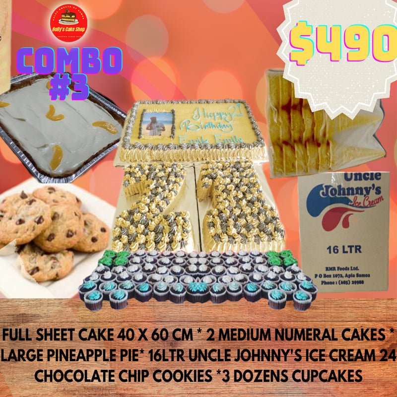 Holly's Cake Combo 3 - Full Sheet Cake 40x60cm, 2 medium Numeral Cakes, Large Pineapple Pie, 24 Choc Chip Cookies, 3 Dozen... Read more
