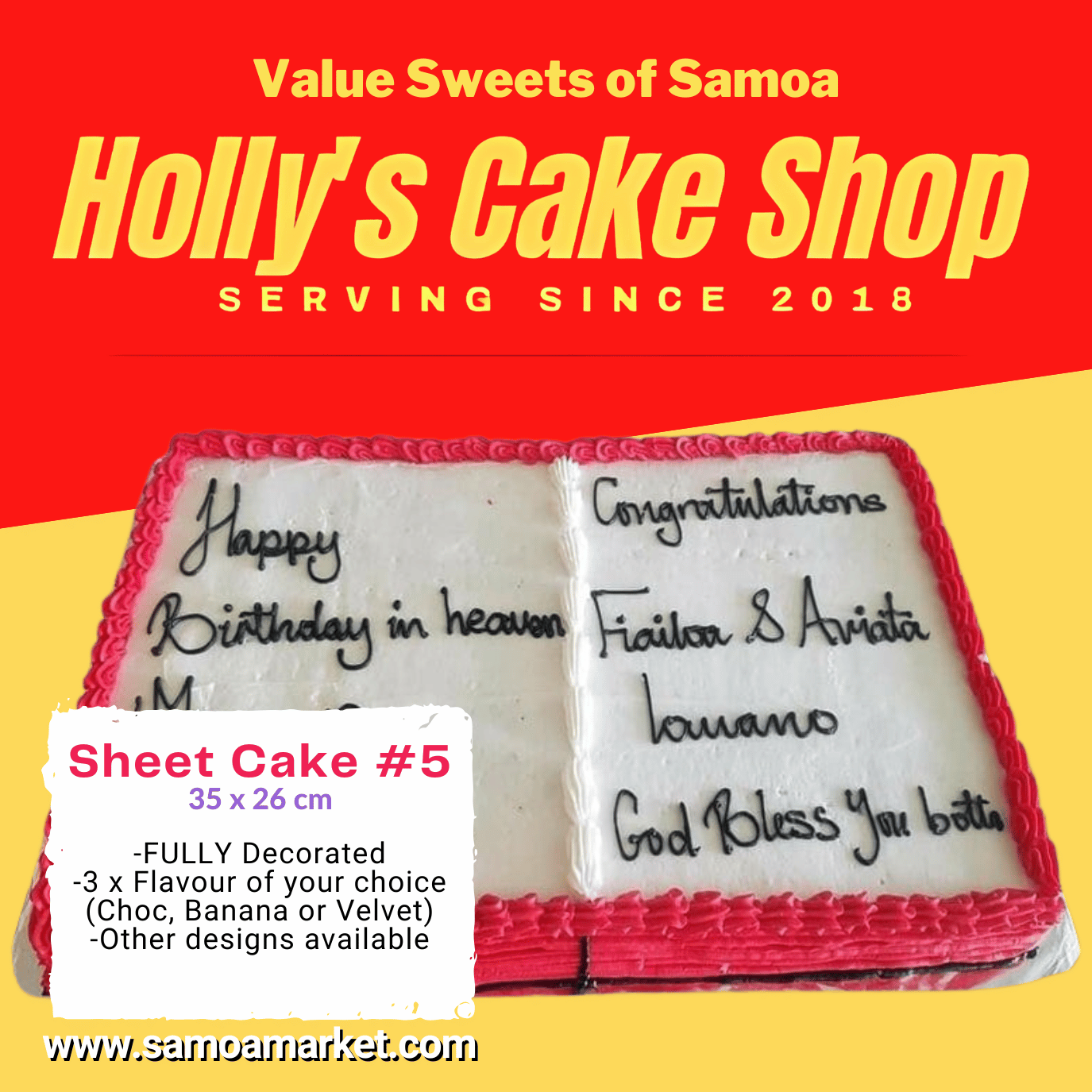 Sheet Cake #5 35x26cm "PICK UP AT VAITELE MARKET SHOP #R8, UPOLU"