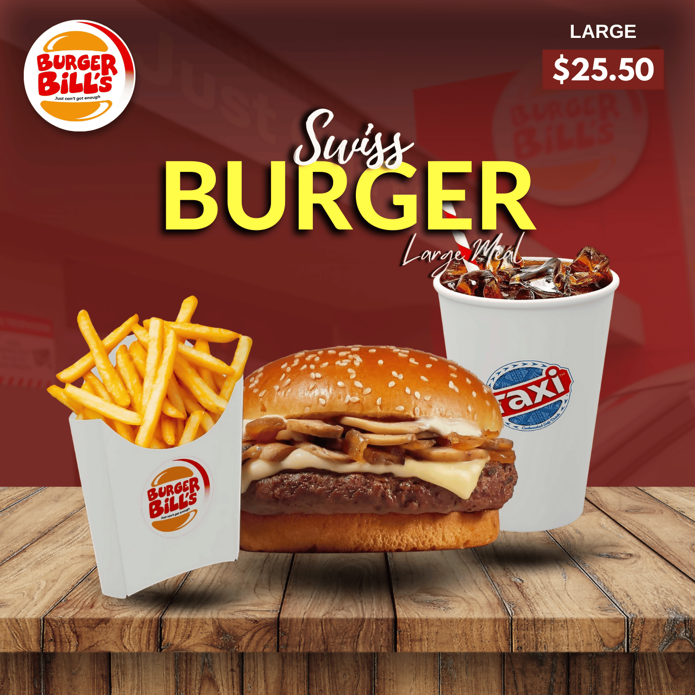 4 DAY ONLY DEAL! Swiss Mushroom Burger Large Meal "PICKUP FROM BURGER BILLS VAITELE ONLY"
