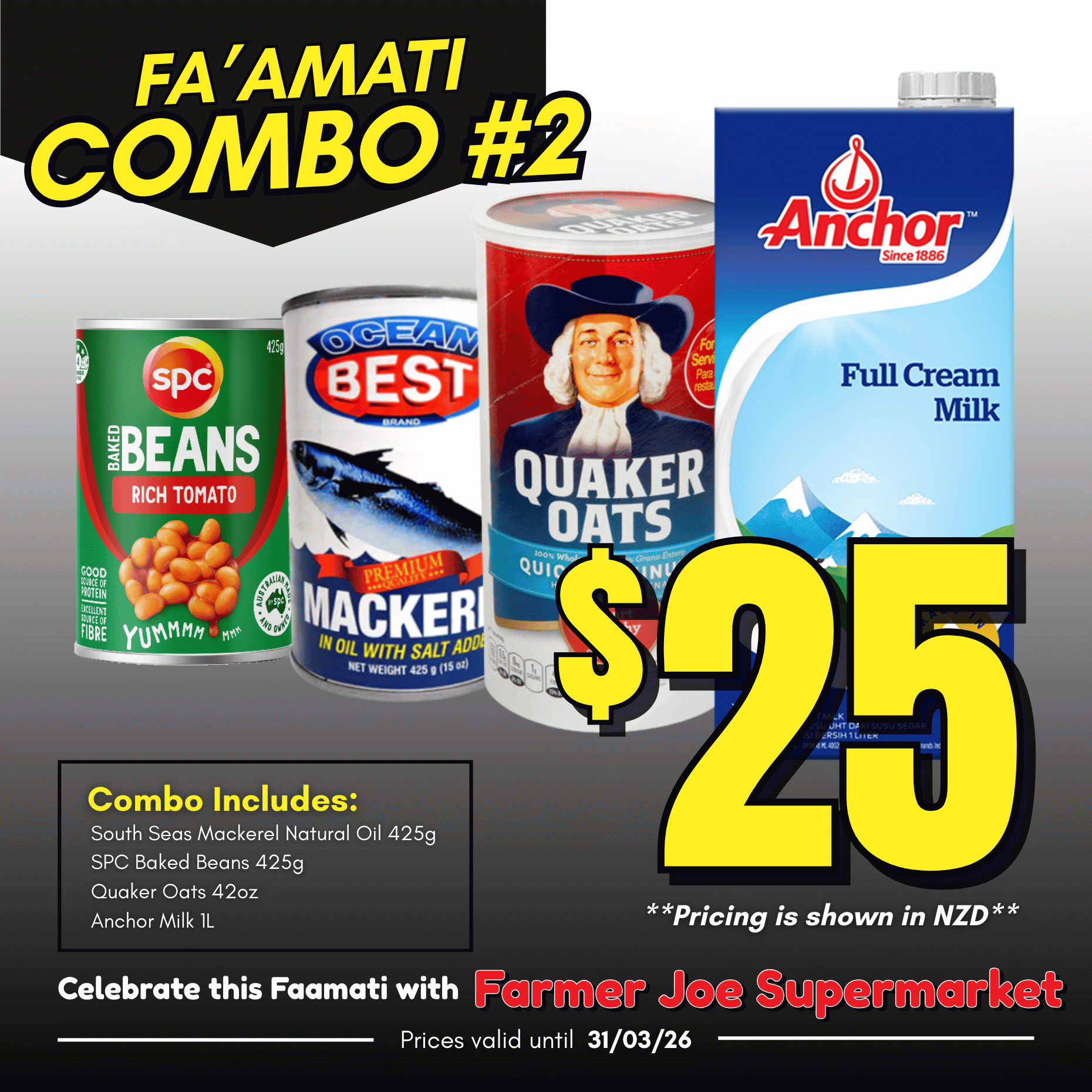COMBO INCLUDES: South Seas Mackerel Natural Oil 425g SPC Baked Beans 425g Quaker Oats 42oz Anchor Milk 1L Disclaimer:This combo... Read more