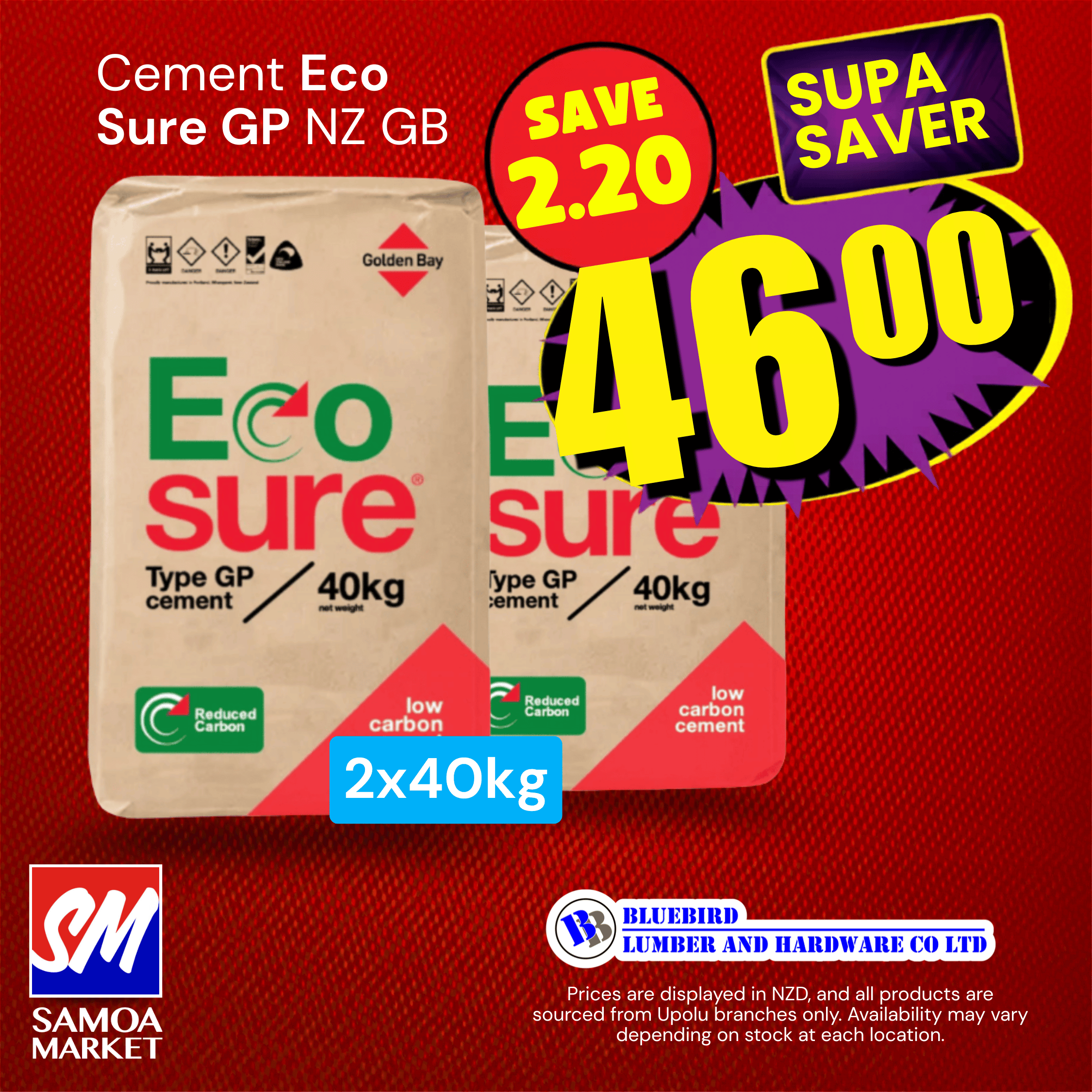 SUPASAVER! Bundle of 2 x Cement Eco Sure GP NZ 40kg bags. Premium quality general purpose cement ideal for concrete work, repairs, and construction projects. PICKUP ONLY at Bluebird Lumber & Hardware, Upolu. Stock availability may vary as walk-in customers also access these in-store specials. If unavailable at pickup time, you may substitute for an item of equal or lesser value, or receive a refund processed to the original payment method.